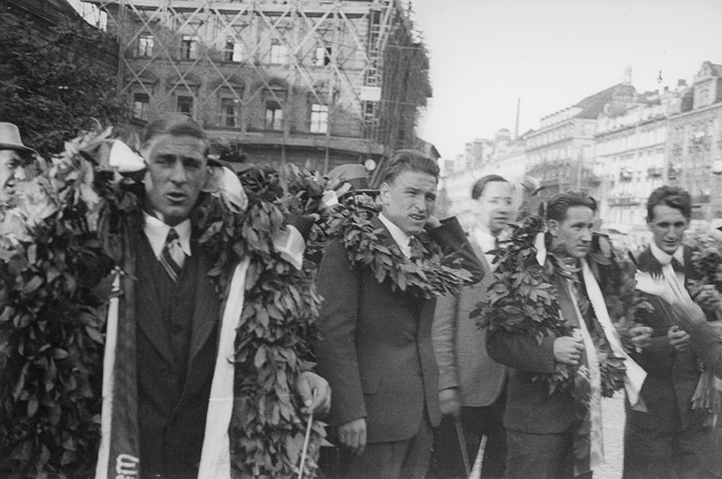 Empfang des Deutschen Meisters 1932 FC Bayern in München, Fußballspieler mit Lorbeerkränzen, v.l. Ludwig Goldbrunner, Josef Bergmaier, Josef Lechler (Juni 1932), Foto von Heinz Valerien. (Stadtarchiv München, DE-1992-FS-ERG-P-0155)