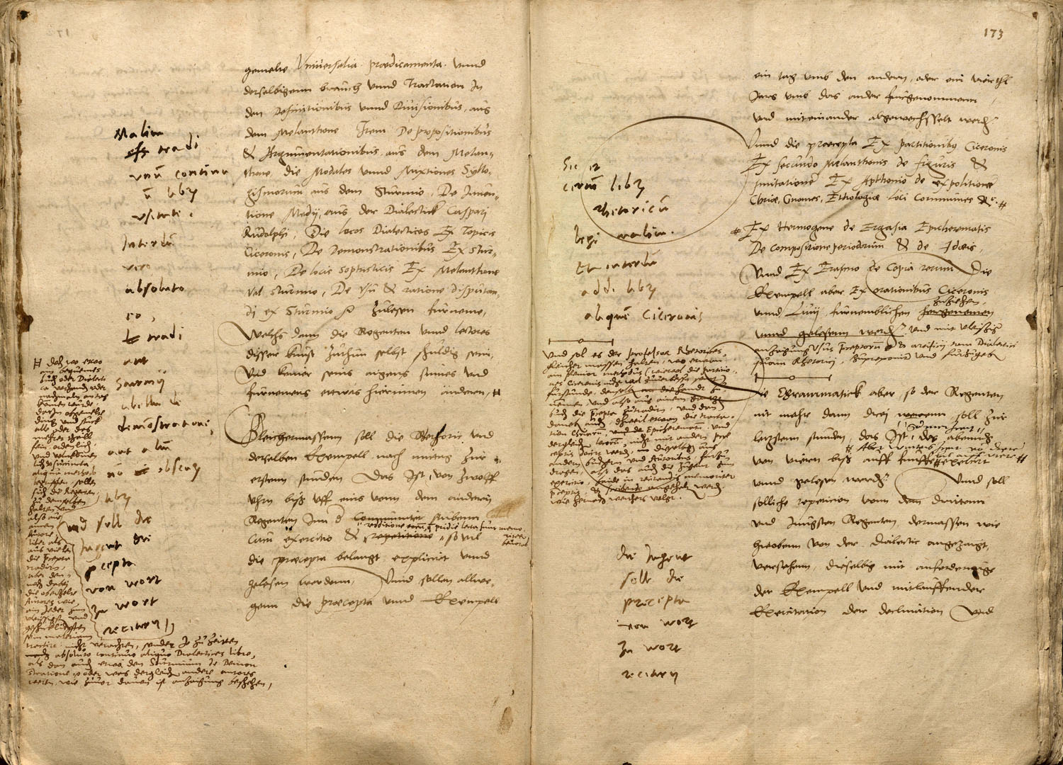 Entwurf der Statuten der Universität Heidelberg mit Anmerkungen Melanchthons und Micyllus`. (Univeritätsarchiv Heidelberg, RA 223, fol. 172v-173)