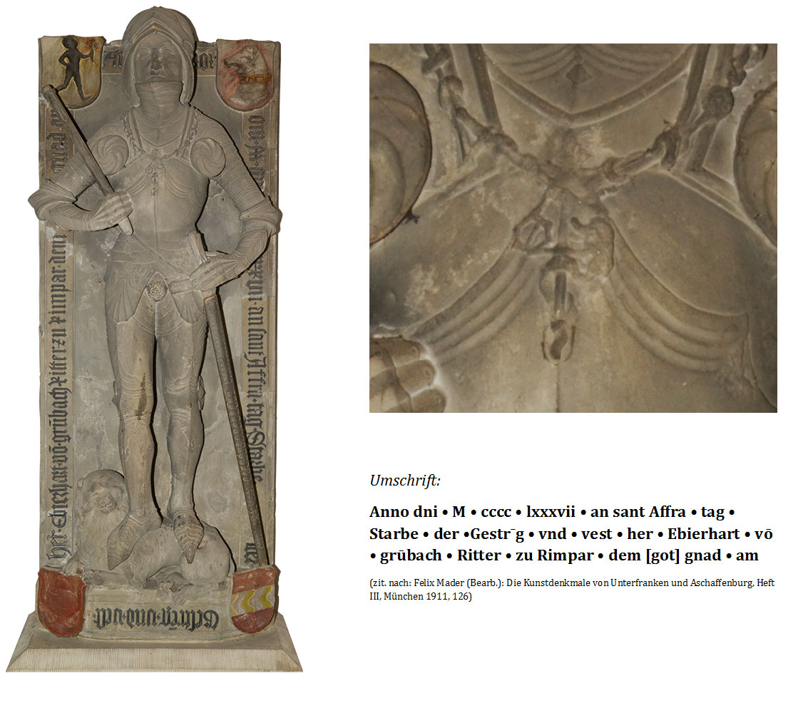 Epitaph Eberhards von Grumbach (gest. 1487) in der Kirche St. Peter und Paul in Rimpar. Das Werk wird Tilmann Riemenscheider (c. 1460-1531) zugeschrieben. Über dem Brustharnisch (Bild rechts) trägt die Figur einen Kette des Cyprischen Ritterordens, an der die Symbole der Gesellschaft mit dem Fürspang und der Gesellschaft zum Bären befestigt sind. (Foto von Tilman2007 lizensiert durch CC BY 3.0 via Wikimedia Commons)
