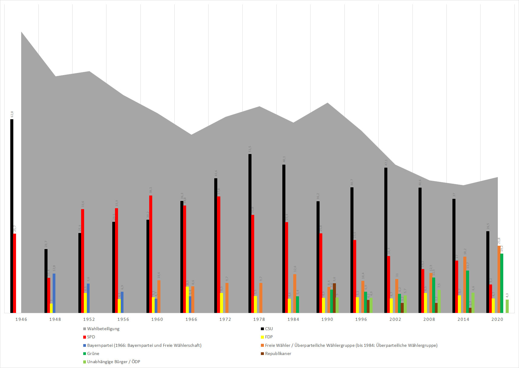 Ergebnisse der Kommunalwahlen in Kempten von 1946 bis 2020. (Quelle: Eigene Darstellung auf Basis der amtlichen Wahlstatistik) HLB