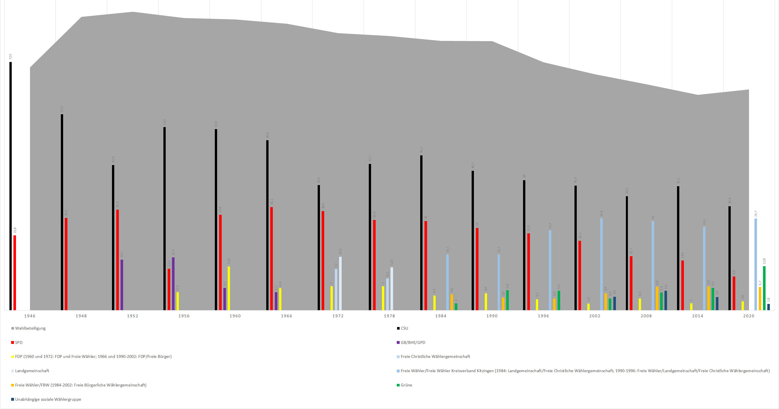 Ergebnisse der Kommunalwahlen im Landkreis Kitzingen von 1946 bis 2020. (Quelle: Eigene Darstellung auf Basis der amtlichen Wahlstatistik) HLB