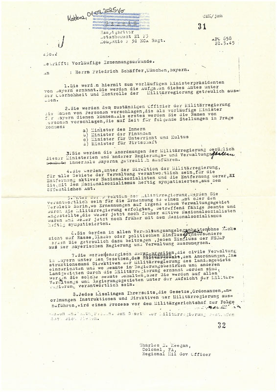 Ernennungsurkunde Fritz Schäffers zum vorläufigen Ministerpräsidenten von Bayern 28.Mai 1945. (Bundesarchiv N 1168/14)