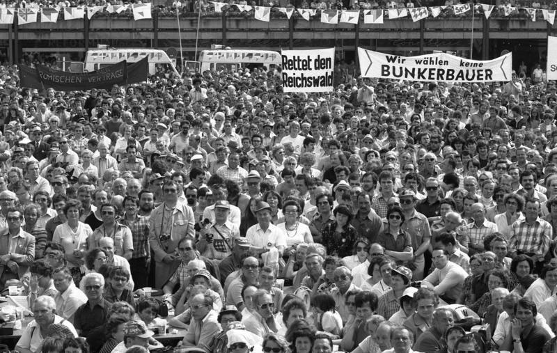 Eröffnungsveranstaltung des Wahlkampfs der SPD zur Europawahl 1979 mit Bundeskanzler Helmut Schmidt und Willy Brandt in Nürnberg (Bundesarchiv, B 145 Bild-F056098-0007 / Wegmann, Ludwig / CC-BY-SA 3.0 via Wikimedia Commons). HLB