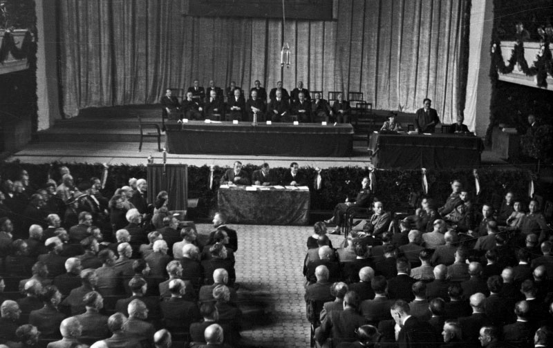 Erste Sitzung der Verfassungsgebenden Landesversammlung in der Aula der Ludwig-Maximilians-Universität in München, Fotografie, 15. Juli 1946. (Haus der Bayerischen Geschichte, Augsburg, bp-0494.1.5)