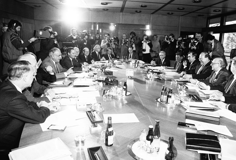{{|1=Erste Sitzung der Koalitionsverhandlungen zwischen CDU, CSU und der FDP nach der Bundestagswahl 1987 im Bundeskanzleramt. (Bild: Bundesarchiv, B 145 Bild-00159969)}}