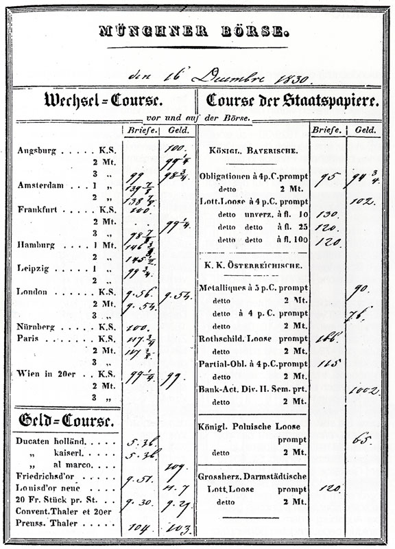 Erstes Kursblatt der Münchner Börse vom 16.12.1830. Notiert sind neben Wechseln und Sorten zwölf Wertpapiere, nämlich eine bayerische Staatsanleihe, vier österreichische Staatspapiere, sechs Lose (staatliche Losanleihen) und die Aktie der Österreichischen Nationalbank. (Bayerisches Wirtschaftsarchiv V5)