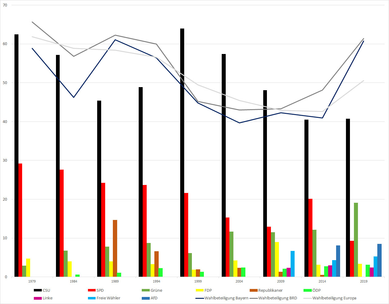 Ergebnisse der Europawahlen 1979-2019 in Bayern. HLB