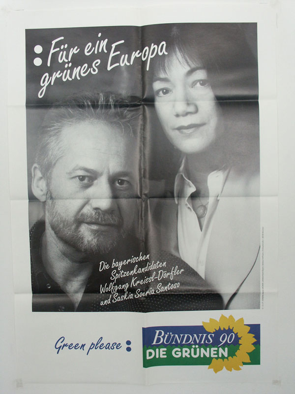 Wahplakat von Bündnis 90/Die Grünen zur Europawahl 1994 mit den bayerischen Spitzenkandidaten Wolfgang Kreissl-Dörfler (geb. 1950) und Saskia Soeria Santoso. (GRÜNE Bayern) HLB