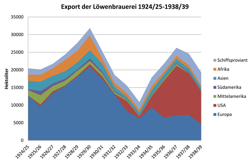 Export der Löwenbrauerei 1924/25-1938/39. (Grafik: Richard Winkler)