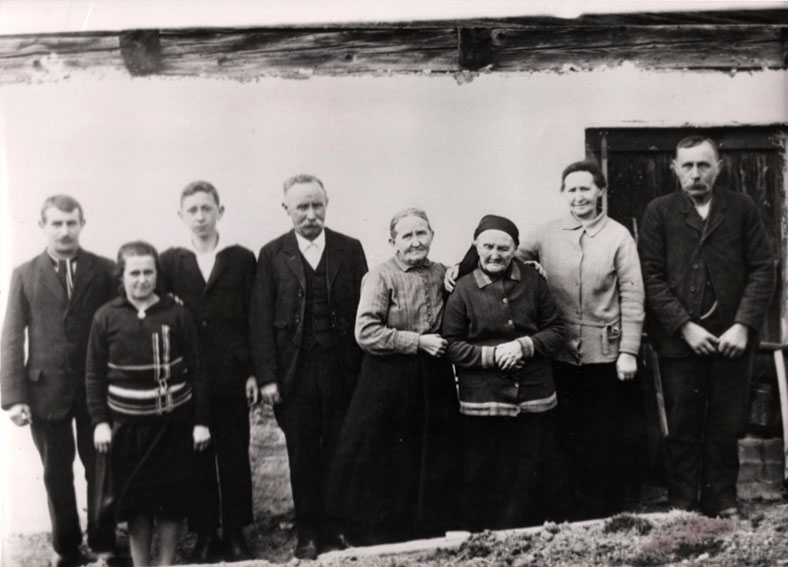 Die Familie von Albert Wimschneider auf einer Fotografie um 1929. V. l. n. r.: Max Wieser, die Magdt Josefa, Albert Wimschneider, Otto Wieser, Lini Wieser, Juliane Wieser, Martina Wimschneider, Albert Wieser. (Zur Verfügung gestellt von Carola Wimschneider)