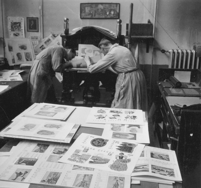 Arbeiter bei den Farbenätzungen während des Andrucks. Teil einer Stereoskopie von 1938. (Bayerische Staatsbibliothek, Bildarchiv hoff-69876) HLB