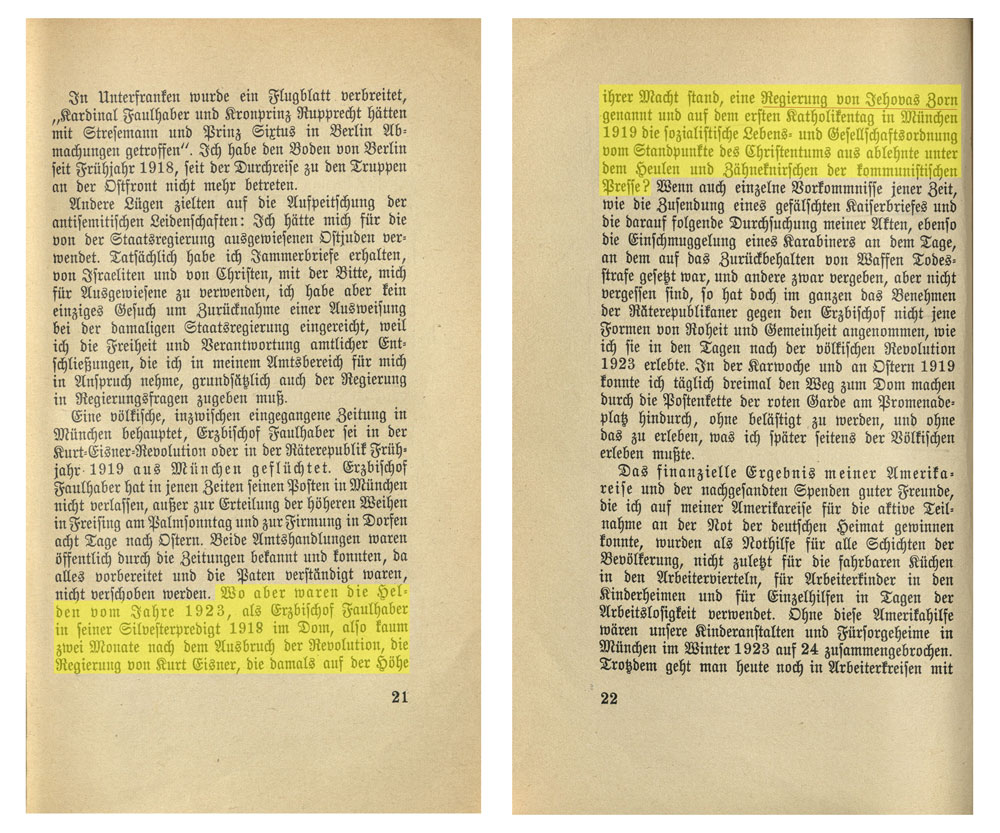 Textstelle aus Faulhabers Schrift "Deutsches Ehrgefühl und katholisches Gewissen" (Montage der Buchseiten mit farblich markiertem Satz). (Bayerische Staatsbibliothek Th.u. 456 e-1)