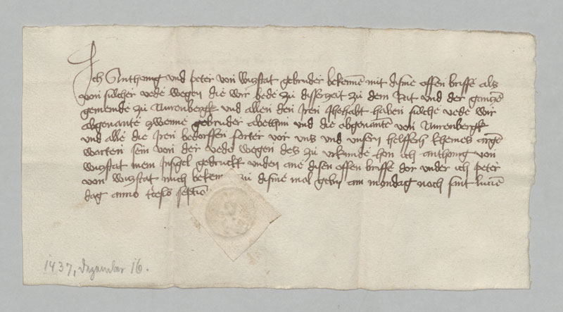 Anthonius und Peter von Wikstat schwören die Fehde gegen die Stadt Nürnberg ab, 16. Dezember 1437. (Staatsarchiv Nürnberg, Reichsstadt Nürnberg, Losungsamt, 35 neue Laden, Urkunden 2178) HLB