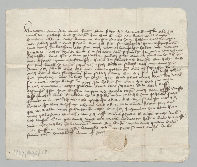 Die Brüder Antonius und Peter von Witztat sagen der Stadt Nürnberg Fehde an, 18. August 1437. (Staatsarchiv Nürnberg, Reichsstadt Nürnberg, Losungsamt, 35 neue Laden,Urkunden 2176) HLB