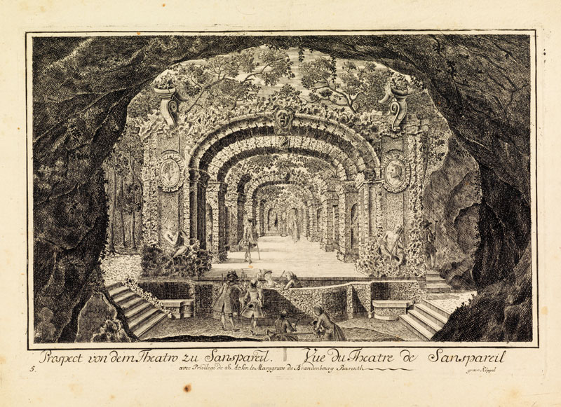 Felsentheater im Garten der Eremitage Sanspareil bei Wonsees. Das im Stil einer künstlichen Ruine erbaute Theater war Teil des Felsengartens, den Markgräfin Wilhelmine als Eremitage zwischen 1744 und 1748 durch Hofbaumeister Joseph Saint-Pierre (c. 1709-1754) anlegen ließ. Kupferstich aus dem Jahr 1748 von Johann Thomas Köppel (1711-1762). (Staatsbibliothek Bamberg, V Ec 69)