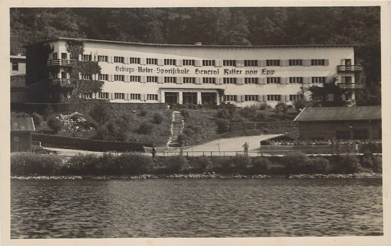 Ferienheim des Architekten Emil Freymuth (1890-1961), 1940er-Jahre. Die ehemalige Urlaubsanlage am Ufer des Kochelsees wurde während der Diktatur des Nationalsozialismus zur "Gebirgsmotorsportschule General Ritter von Epp" umgewidmet. (Gemeindearchiv Kochel) HLB
