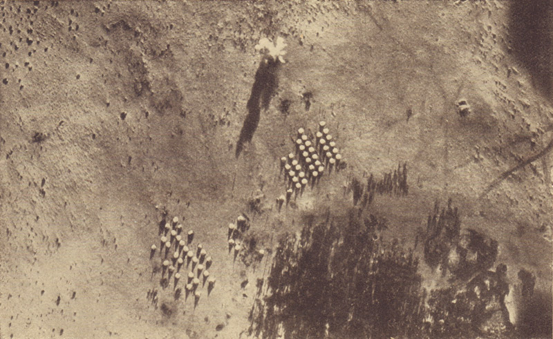 Englisches Truppenlager in der Oase el Katia. Neben dem Lager explodiert eine deutsche Fliegerbombe. (Abb. aus: Zeidelhack, Max: Bayerische Flieger im Weltkrieg: Ein Buch der Taten und Erinnerungen. München 1919, 69) HLB