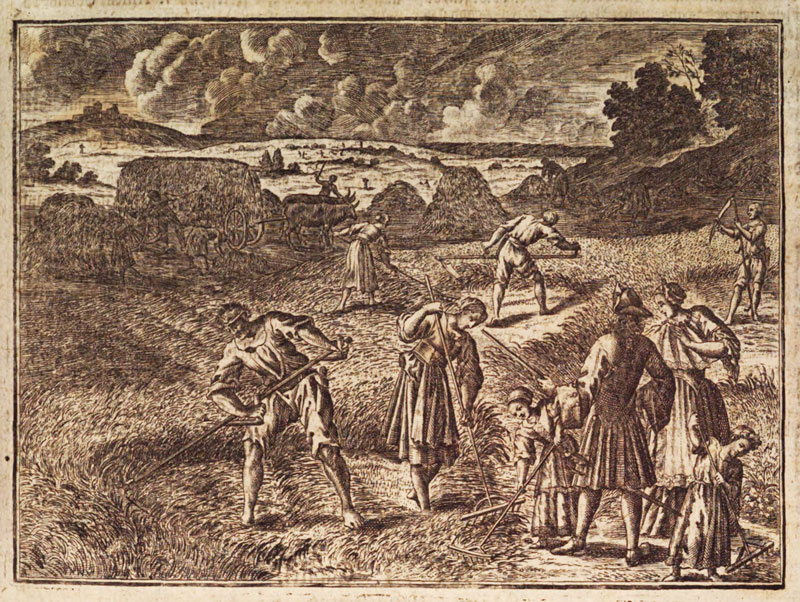 Kupferstich, Darstellung einer Heuernte um 1750. Abb. aus: Franz Philipp Florin, Oeconomus prudens et legalis continuatus […], Bd. 1, Nürnberg 1750, 637. (Augsburg, Staats- und Stadtbibliothek, 2 H 112 -1)