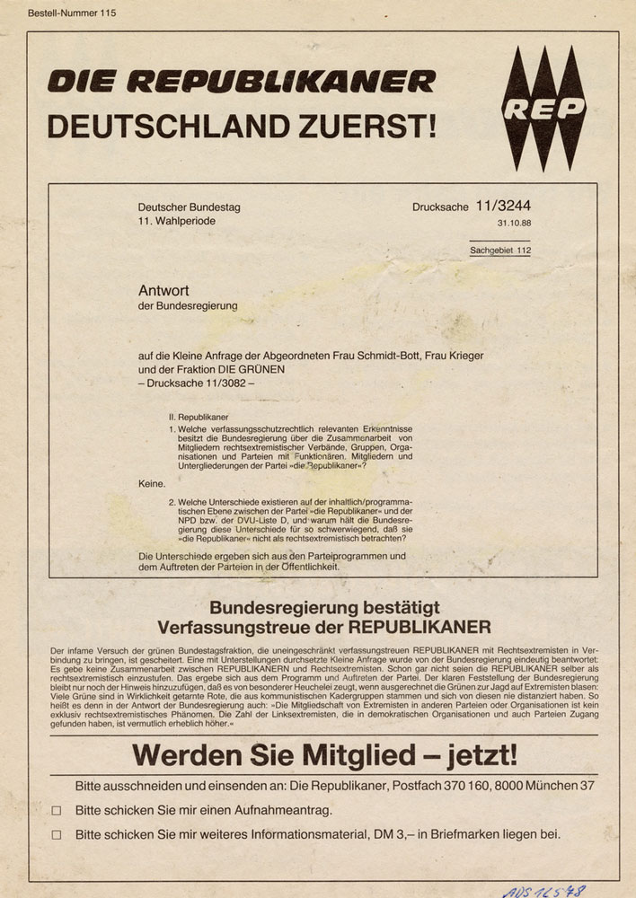 Flugblatt der "Republikaner" vom 31.10.1988, auf dem die Partei um neue Mitglieder wirbt. Anlass war die Antwort der Bundesregierung auf eine Kleine Anfrage mehrerer Abgeordneter und der Fraktion Die Grünen bezüglich verfassungsschutzrechtlich relevanter Erkenntnisse zu den "Republikanern". (Stadtgeschichtliches Museum Leipzig, Inventarnummer ADS 12578) HLB