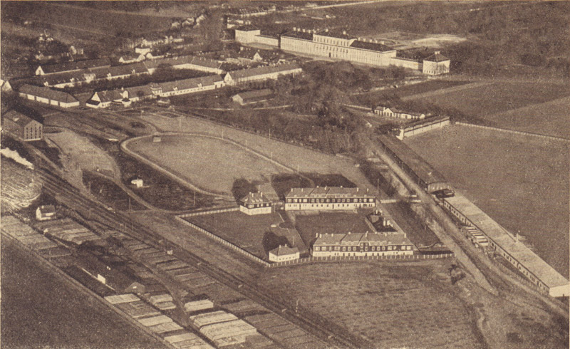 Die Flugplatzanlagen in Schleißheim im Jahre 1916: In der Mitte die Kasernements, rechts Flugplatz mit 3 Hallen und Kraftwagenhalle. (Abb. aus: Zeidelhack, Max: Bayerische Flieger im Weltkrieg: Ein Buch der Taten und Erinnerungen. München 1919, 163) HLB
