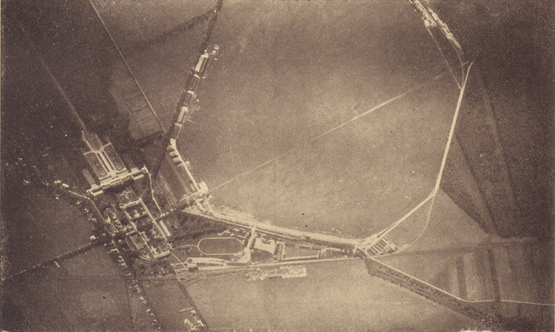 Die Flugplatzanlagen in Schleißheim 1918: Im Halbkreis um den Flugplatz eine Großflugzeughalle (links oben) und 11 Flugzeughallen. In d. Mitte neues Mannschaftsbarackenlager, rechts Geräteverwaltung. (Abb. aus: Zeidelhack, Max: Bayerische Flieger im Weltkrieg: Ein Buch der Taten und Erinnerungen. München 1919, 163) HLB