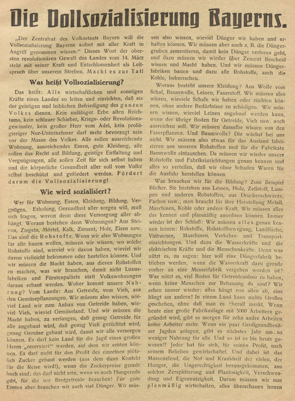 In der Flugschrift "Die Vollsozialisierung Bayerns." klärte das Zentralwirtschaftsamt über den Begriff und die Pläne zu Sozialisierungsmaßnahmen auf. (Bayerische Staatsbibliothek, 4 H.un.app. 219 t)