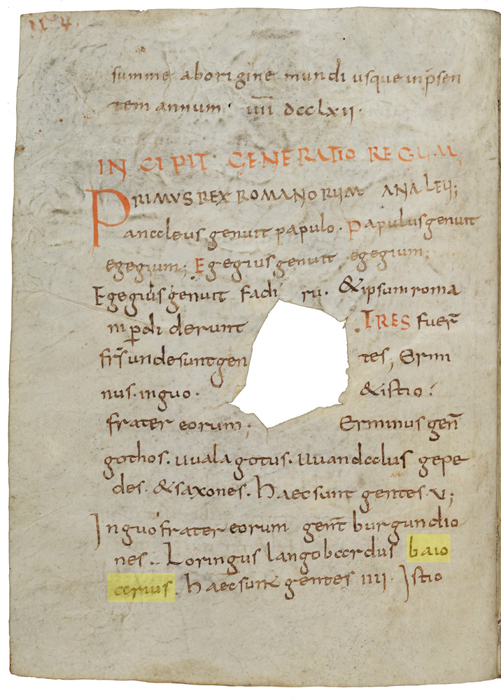 Erste Nennung des Namens baioarius in der Fränkischen Völkertafel. Ausschnitt aus: Sammelhandschrift, Bayern (?) 1. Viertel 9. Jh., p. 154. (Stiftsbibliothek St. Gallen, Cod. Sang. 732, lizensiert durch CC BY-NC 4.0) HLB
