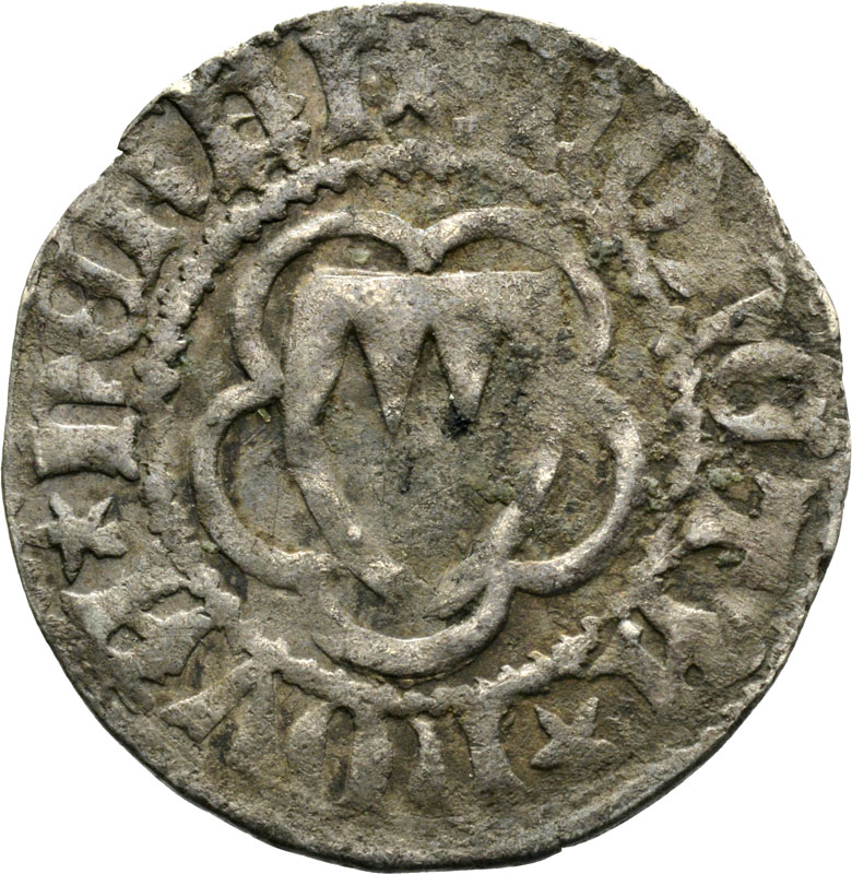 {{|1=Halbgroschen des Würzburger Bischofs Gerhard von Schwarzburg (reg. 1372-1400). Auf dieser Münze erscheint erstmals der Fränkische Rechen. (Staatliche Münzsammlung, Inventarnummer: 13-0045)}}