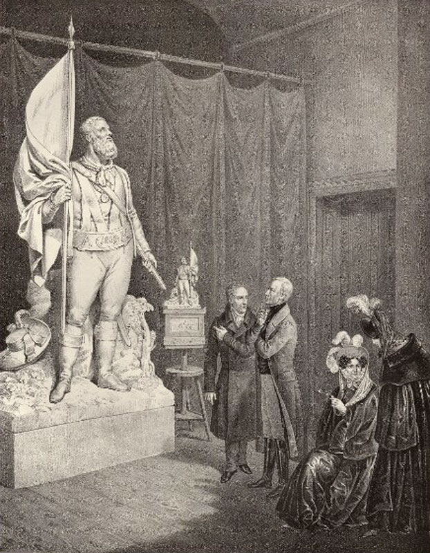 Kaiser Franz I. und Karoline von Österreich besichtigen das Atelier des Bildhauers Nepomuk Schaller mit dessen Standfigur des Andreas Hofer im Dezember 1833. (Österreichische Nationalbibliothek, Bildarchiv und Grafiksammlung Pk 25, 32) HLB
