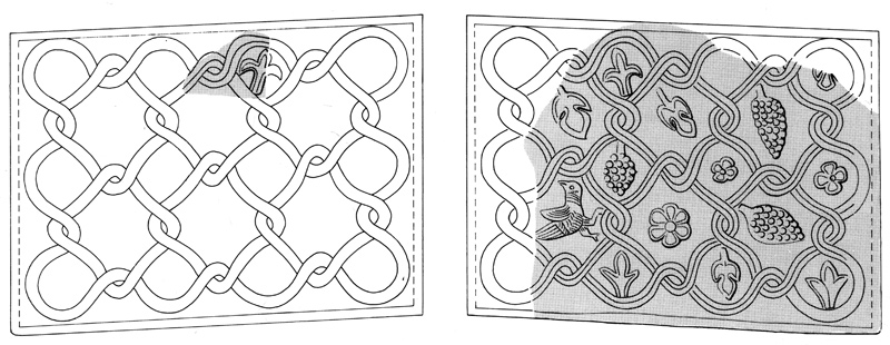 Rekonstruktionsvorschläge für zwei der Sandsteinfragmente aus der frühmittelalterlichen Kirche als Brüstungsplatten eines Lesepultes. Fundort: Frauenwörth, Frauenchiemsee. Abb. aus: H. Dannheimer: Frauenwörth (2006), 30. (Hermann Dannheimer) HLB