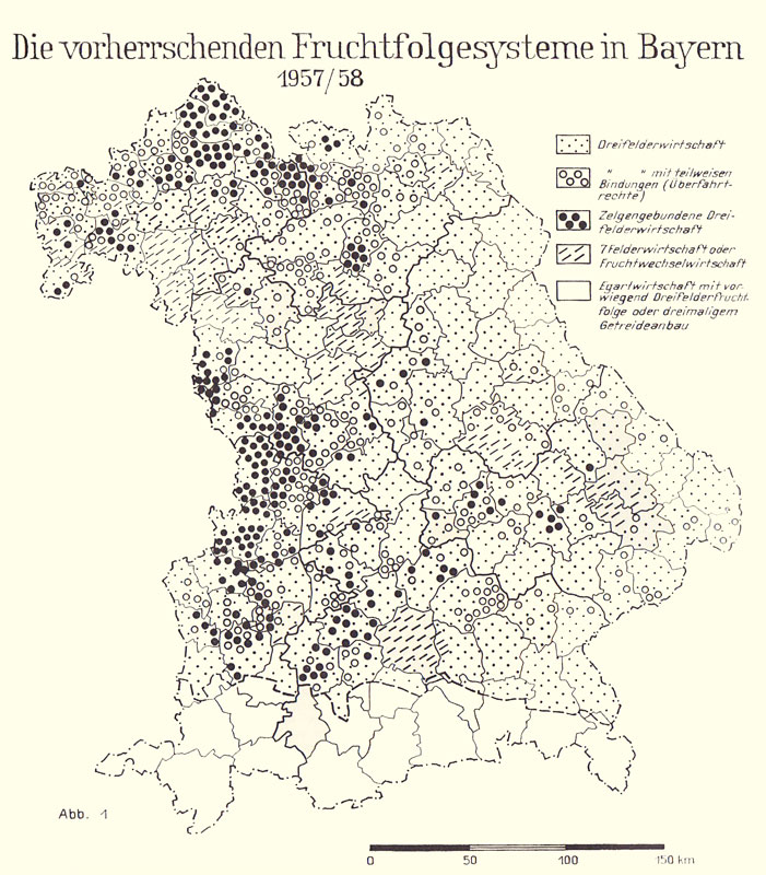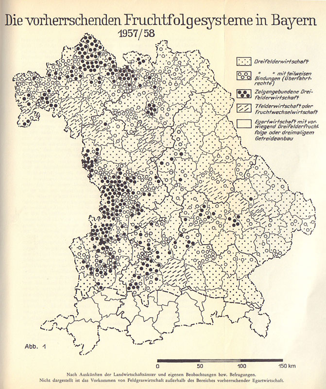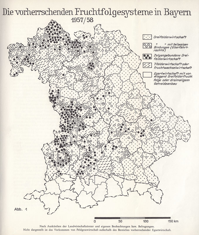 Abbildung 4: Vielfalt der Fruchtfolgesysteme in Bayern in der zweiten Hälfte des 20. Jahrhunderts. Selbst die Drei- und Mehrzelgenwirtschaft und damit der Flurzwang überlebten mancherorts so lange. Abb. aus Christoph Borcherdt, Fruchtfolgesysteme und Marktorientierung als gestaltende Kräfte der Agrarlandschaft in Bayern, Saarbrücken 1960, 78/79. (Verlag und Druckerei Michael Laßleben, Inhaber: Erich Laßleben) HLB