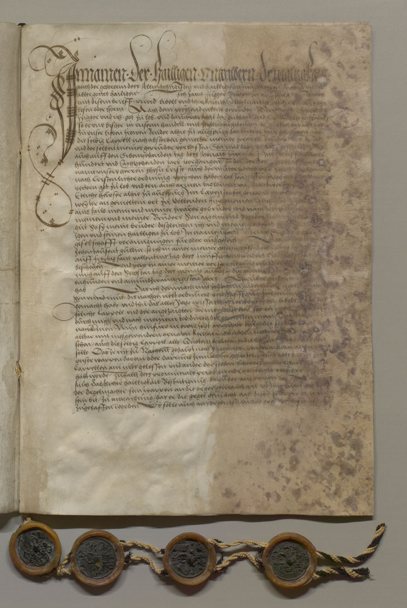 Erste Seite des Stiftungsbriefs Jakob Fuggers (1459-1525) von 1521. (Fürstlich und Gräflich Fuggersches Familien- und Stiftungsarchiv, FA 81.2) HLB