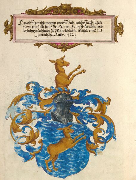 Wappen der "Fugger vom Reh". Abb. aus: Das Ehrenbuch der Fugger, Handschrift 1545-1547, S. 6. (Bayerische Staatsbibliothek, Cgm 9460) HLB