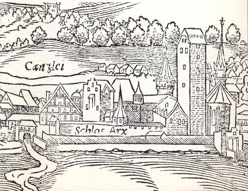 Die mittelalterliche Burg der Fürstäbte von Fulda - Ansicht von Osten (Ausschnitt aus der Stadtansicht Brosamers, um 1550)