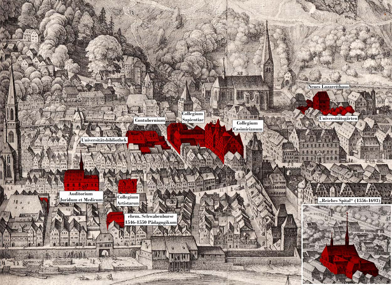 Gebäude der Universität Heidelberg um 1600. Ausschnitt aus Radierung "Haidelberga" Matthäus Merian d.Ä. (1593-1650), Heidelberg 1620. (Gestaltung: Stefan Schnupp; Vorlage: Universität Heidelberg, Graph. Slg. I,63)