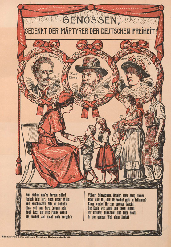Gedenkblatt, das Kurt Eisner in eine Reihe mit Rosa Luxemburg (1871-1919) und Karl Liebknecht (1871-1919) stellt. (bavarikon)([http://daten.digitale-sammlungen.de/bsb00111928/image_23 Bayerische Staatsbibliothek, 2 H.un.app. 44 m)