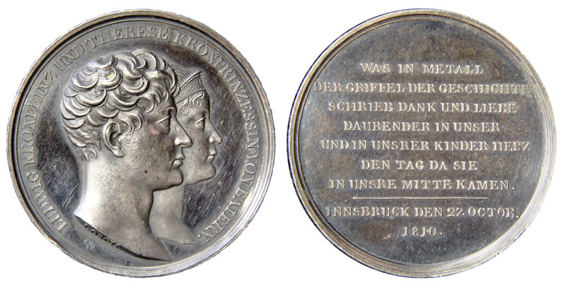 Gedenkmedaille mit Büsten von Kronprinz Ludwig und Kronprinzessin Therese, anlässlich der Anwesenheit des Paares in Innsbruck, 22. Oktober 1810. (Tiroler Landesmuseen, Historische Sammlung, Inv.-Nr. MOA/275)