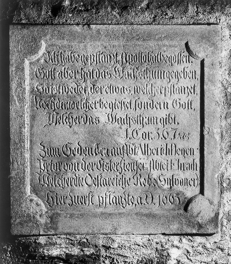 Gedenktafel für die erste Silvanerpflanzung in Würzburg durch Abt Alberich Degen 1665 (Bürgerspital Weingut Würzburg).