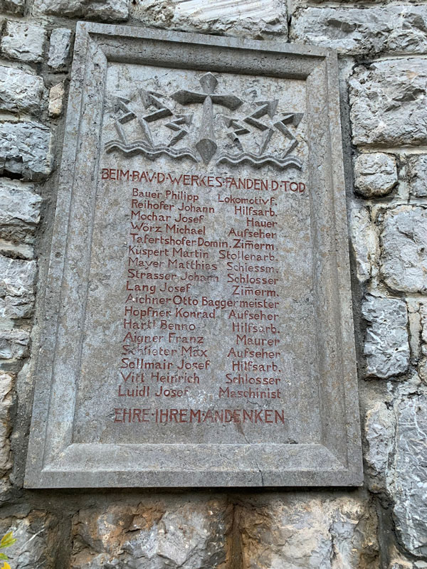 Gedenktafel für die beim Bau des Walchenseekraftwerks ums Leben gekommenen Arbeiter, ca. 1925. (Uniper Kraftwerke) HLB