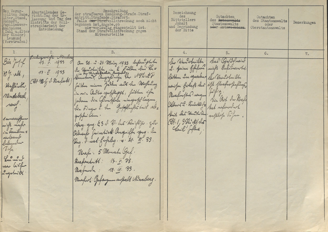 Auszug aus dem Akt der Staatsanwaltschaft Nürnberg-Fürth über den Viehhändler Josef Bär aus Windsbach (Lkr. Ansbach), der nach verunglimpfenden Äußerungen über NSDAP-Angehörige durch das Sondergericht Nürnberg zu einer fünfmonatigen Gefängnisstrafe verurteilt worden war. (Staatsarchiv Nürnberg, Anklagebehörde bei dem Sondergericht Nürnberg 1, Bl. 5a) HLB