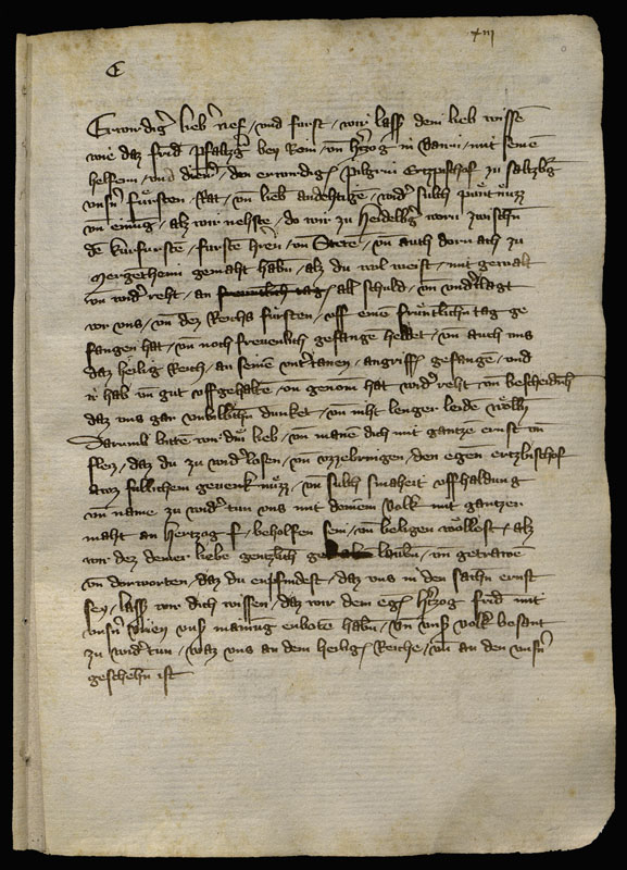 Bericht von der Gefangennahme und Entführung des Salzburger Erzbischofs Pilgrim durch Herzog Friedrich von Bayern (1339.1393). (Staatsarchiv Nürnberg Rep. 52b, 137/XIIIr)