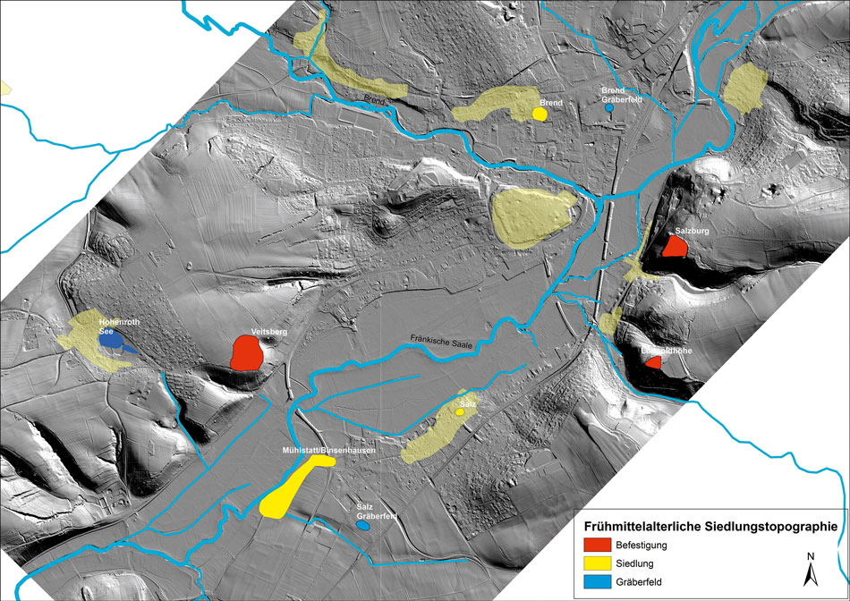 Digitales Geländemodell (1m-Raster) mit frühmittelalterlicher Siedlungstopographie im Neustädter Becken. (Geobasisdaten: [www.geodaten.bayern.de Bayerische Vermessungsverwaltung] lizenziert durch CC BY 4.0; Kartographie nach Lukas Werther, ergänzt Petra Wolters) HLB