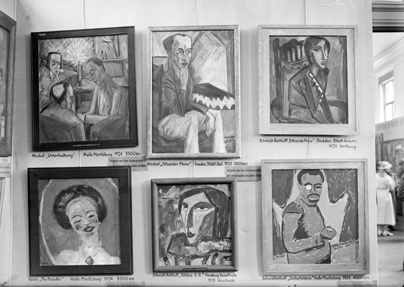 Gemälde von Erich Heckel (1883-1970) Karl Schmidt-Rottluff (1884-1976) und Emil Nolde (1867-1956) in der Ausstellung "Entartete Kunst", Raum 4 im Obergeschoß, Juli 1937. Foto: Kurt Huhle. (Stadtarchiv München, DE-1992-FS-NS-01567) HLB