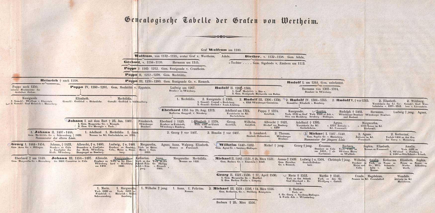 Die Genealogie der Grafen von Wertheim nach Joseph Aschbach. Abb. aus: Joseph Aschbach, Geschichte Geschichte der Grafen von Wertheim, erster Teil, Frankfurt a. M. 1843, nach 400. (Bayerische Staatsbibliothek, Geneal. 6 m-1/2)