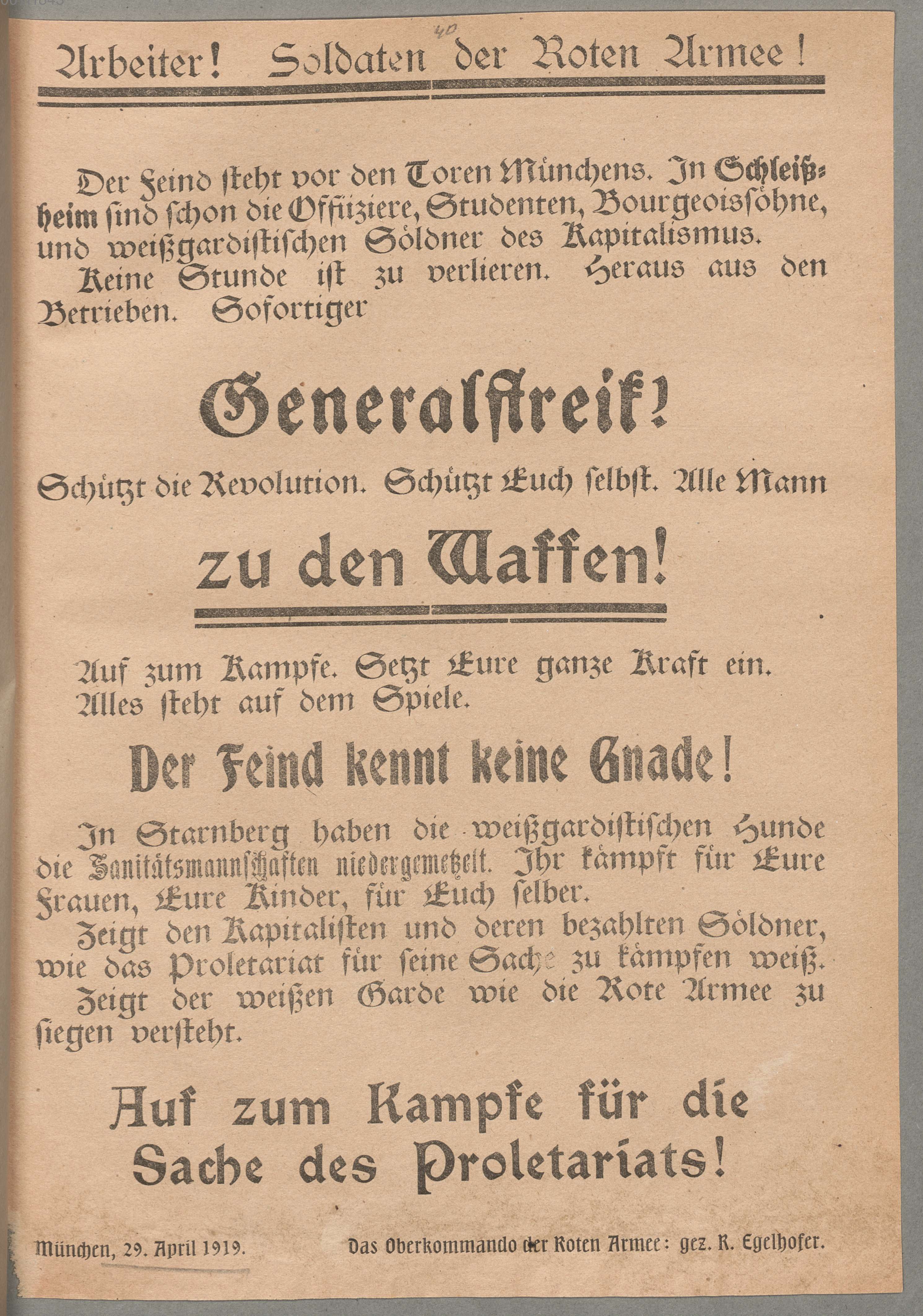 Aufruf zum Generalstreik und zur Verteidigung gegen die "weißgardistischen Hunde" vom 29. April 1919, herausgegeben vom Oberkommando der Roten Armee (gez. Rudof Egelhofer). (bavarikon) (Bayerische Staatsbibliothek, 4 H.un.app. 219 t)