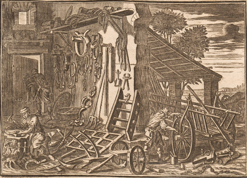 Die Abbildung zeigt diverse bäuerliche Gerätschaften, u.a. Pflug, Egge, Leiterwagen. Abb. aus: Franciscus Philippus Florinus: Oeconomus prudens et legalis. Nürnberg 1750, 554. (Bayerische Staatsbibliothek) HLB