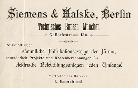Geschäftskarte des ersten Technischen Büros von Siemens überhaupt. Der erste Auftrag des jungen Vertriebsbüros kam von Herzog Karl Theodor von Bayern (1839-1909), der für seine Augenarztpraxis eine elektrische Beleuchtungsanlage bestellte, 1890. (Siemens Historical Institute) HLB