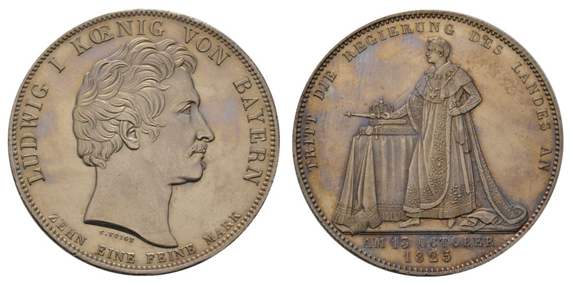Geschichtstaler, den Ludwig I. anlässlich seines Regierungsantritts am 13. Oktober 1825 prägen ließ. Silbermünze, gestaltet von Carl Friedrich Voigt (1800-1874). (bavarikon) (Staatliche Münzsammlung München 6-07635, lizenziert durch CC BY-NC-SA 4.0) HLB