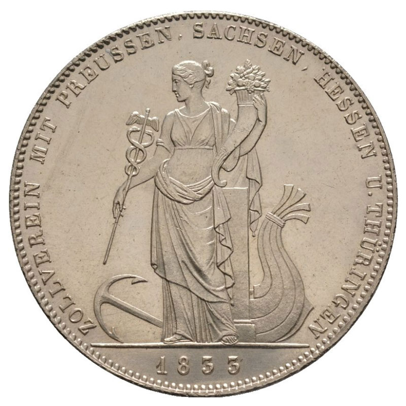 Geschichtstaler, den Ludwig I. anlässlich der Unterzeichnung des Zollvereinsvertrages am 22. März 1833 prägen ließ. Silbermünze, gestaltet von Carl Friedrich Voigt (1800-1874). (bavarikon) (Staatliche Münzsammlung München 6-07635, lizenziert durch CC BY-NC-SA 4.0) HLB