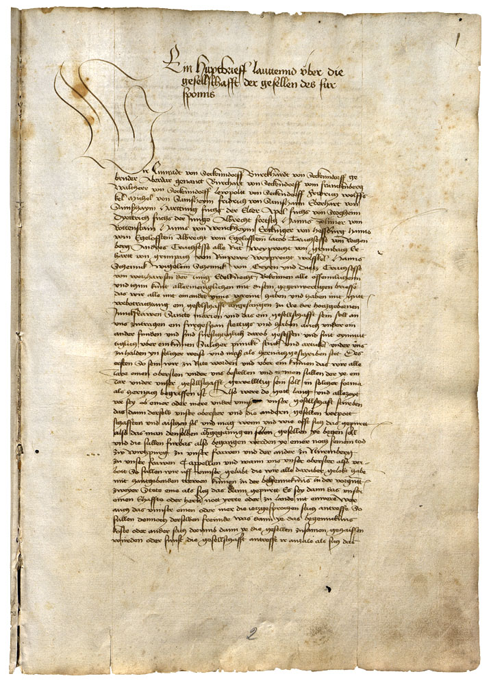 Abschrift des Stiftungsbriefs und der Satzung der Gesellschaft mit dem Fürspang im sog. Gesellschaftsbuch. (Staatsarchiv Nürnberg, Amts- und Standbücher 340)